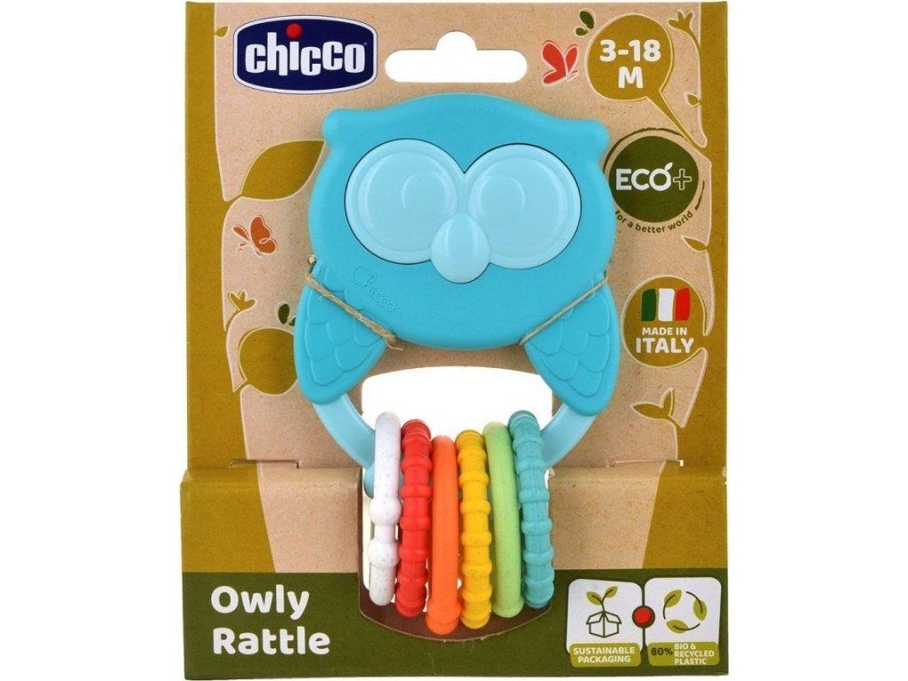 Hračka je vyrobena z 80 % z recyklovaného plastu a bioplastu z rostlinných zdrojů. Chrastítko Sova je součástí řady Chicco Eco+, hraček vyrobených z recyklovaného plastu a bioplastu, které se vyrábí v Itálii. Tyto hračky jsou navrženy tak, aby děti zapojily do hry a pomohly jim pochopit, jak se věci vyrábějí a jak fungují, když se dají dohromady.
