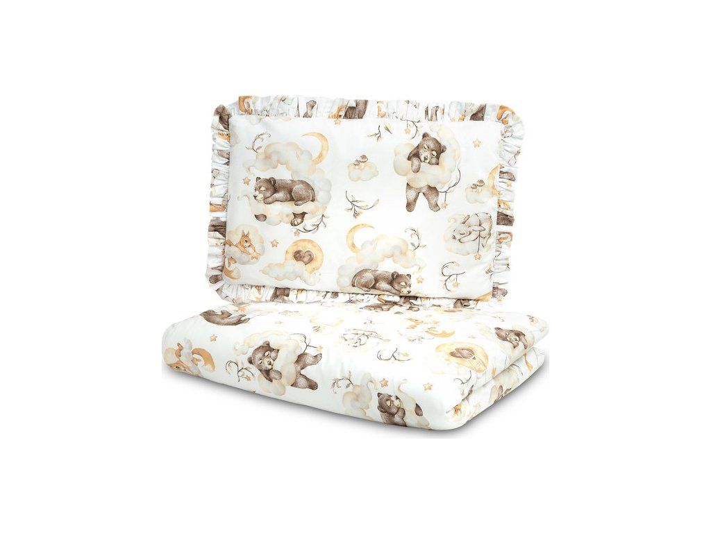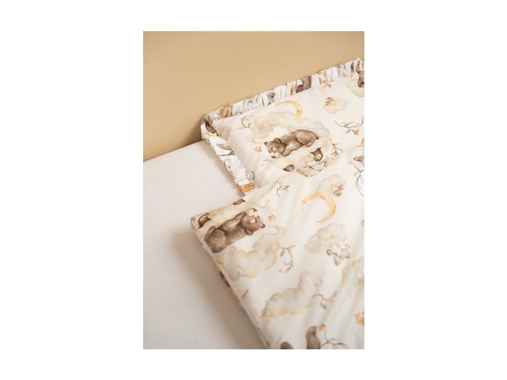Dvojdielna detská posteľná bielizeň s volánom je vyrobená z mäkkej na dotyk a odolnej 100 % bavlny. Farebné kombinácie pripravené v kolekcii sa dokonale hodia do každej detskej izby. Súprava obsahuje obliečku na prikrývku 100x135 cm a obliečku na vankúš 40x60 cm. Obliečka na prikrývku sa zapína na zips, obliečka na vankúš je skladacia.
