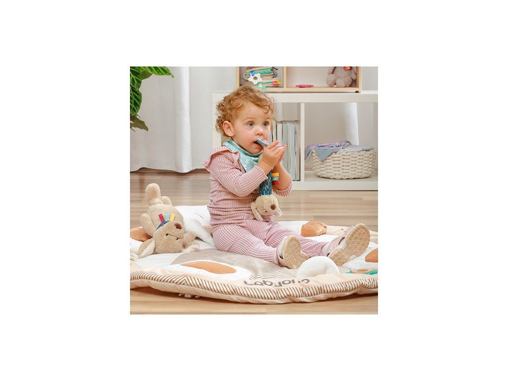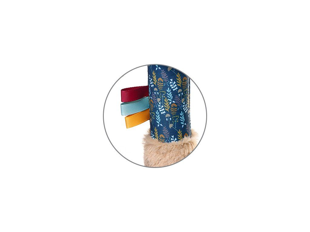 Mäkké uši podporujú dotyky a farebné vyčnievajúce štítky umožňujú tréning malých ručičiek.