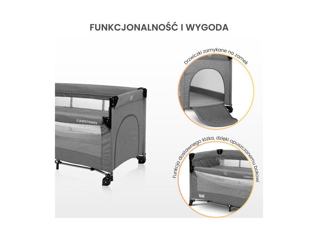 Detská postieľka Esti je cestovná postieľka navrhnutá na uľahčenie starostlivosti o bábätká. Jej najväčšou výhodou je znížená bočnica, ktorá premení postieľku na prístelku a poskytuje pohodlnejší prístup k dieťaťu. Praktický skladací mechanizmus znamená, že zloženie alebo rozloženie trvá len chvíľu. Detská postieľka má aj aretačné kolieska na jednoduché premiestňovanie. Bočné dvere na zips umožňujú starším deťom bezpečný prístup do postieľky, ktorú možno použiť ako ohrádku.