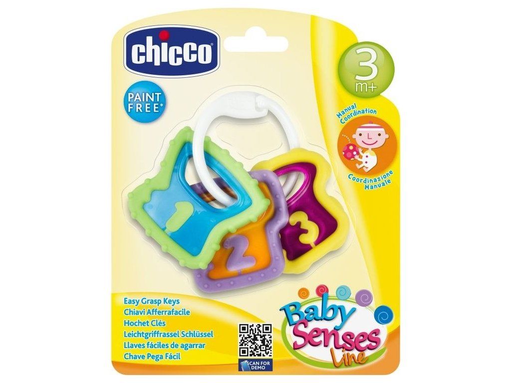 Hrkálka Keys je ľahká a ľahko ovládateľná hrkálka, ideálna pre deti v prvých mesiacoch života. Skladá sa z 3 závesov v tvare kľúčov s vyrazenými číslami. Živé, kontrastné farby priťahujú pozornosť dieťaťa. Hračka stimuluje manuálnu zručnosť dieťaťa.