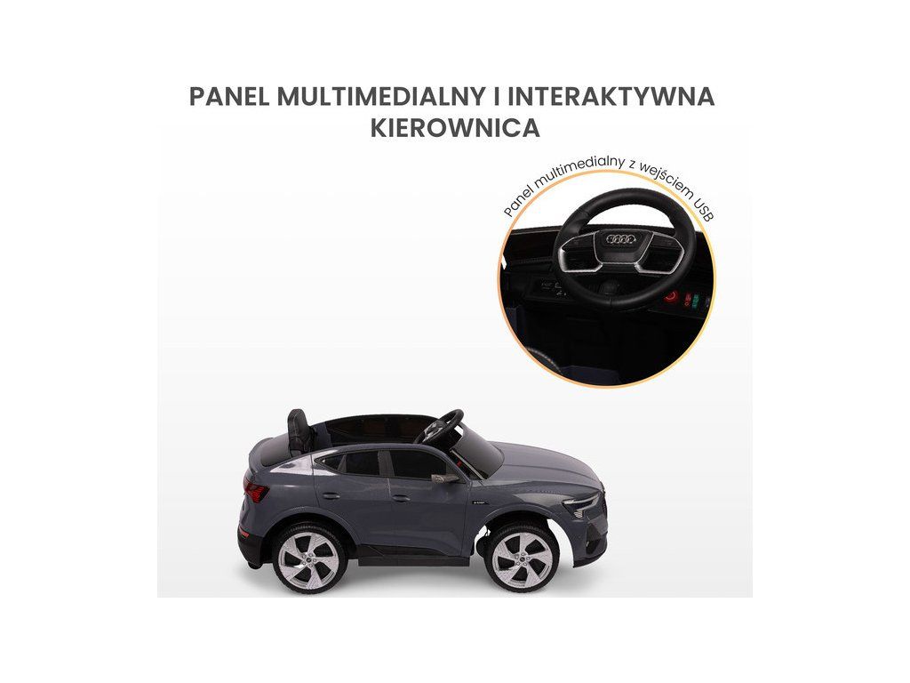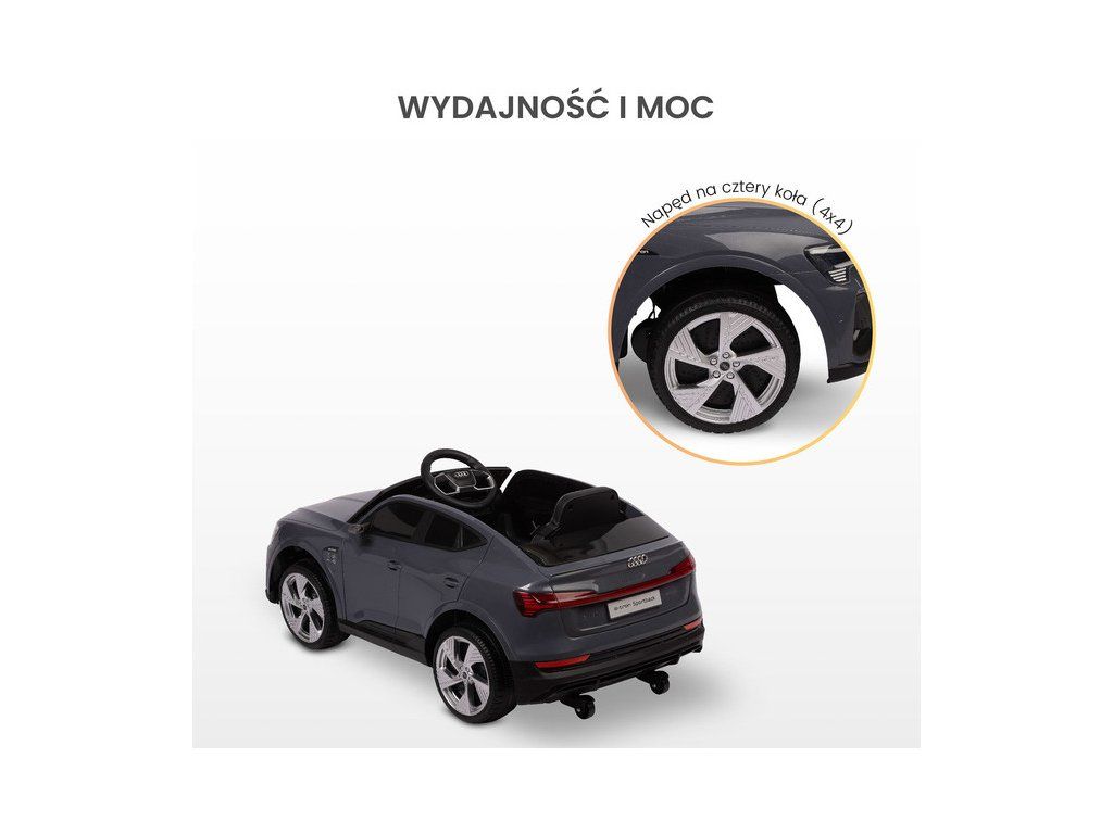 Audi E-tron Sportback je licencovaný akumulátorový autíčko značky Toyz, ktorý spája elegantný design s dynamikou elektrického pohonu. Tento model sa vyznačuje charakteristickou líniou karosérie Audi, modernými úzkymi zrkadlami a spojeným zadným svetlom. Vnútorná sila modelu E-tron Sportback spočíva v pohone 4 kolies s motormi 45 W, ktoré sú napájané batériou s kapacitou 7 Ah. Pohodlie a bezpečnosť zaisťujú: zadné tlmiče, kolesá z penovej EVA, sedadlo z ekokože, 3-bodové bezpečnostné pásy, voľný štart, dva režimy rýchlosti a automatická brzda.