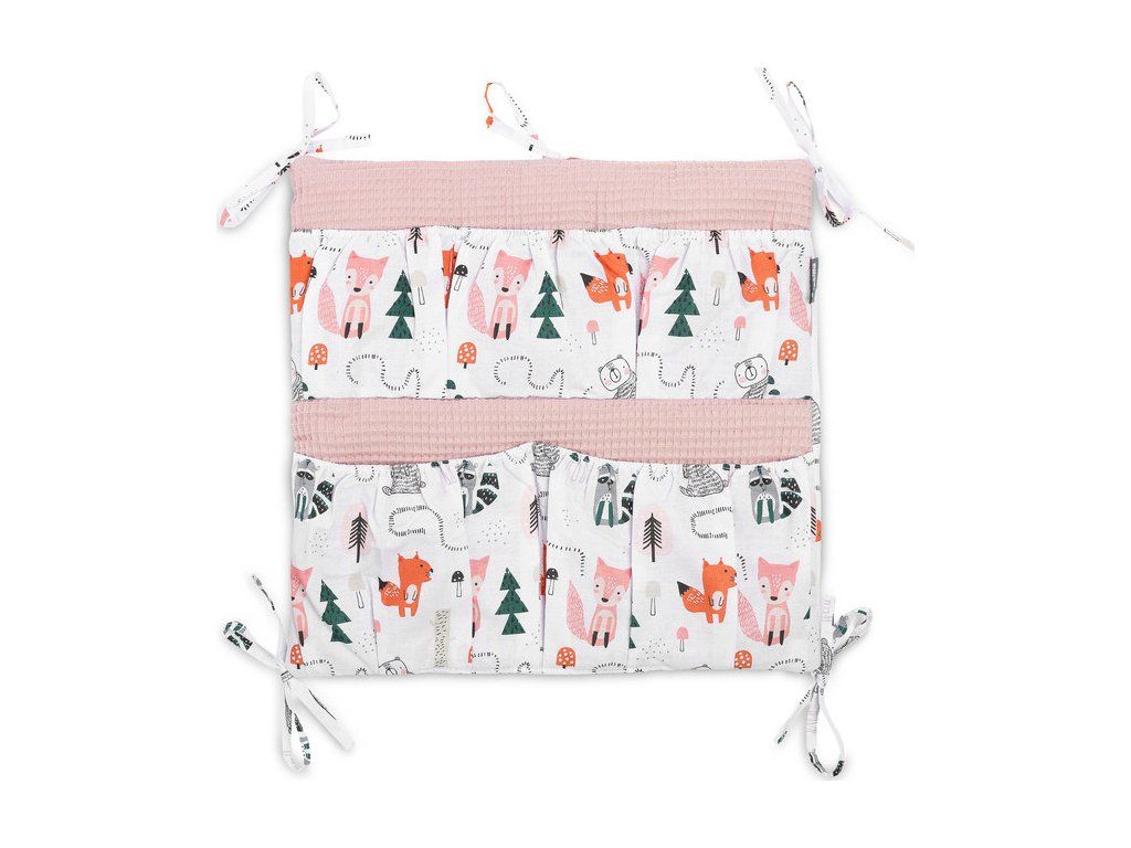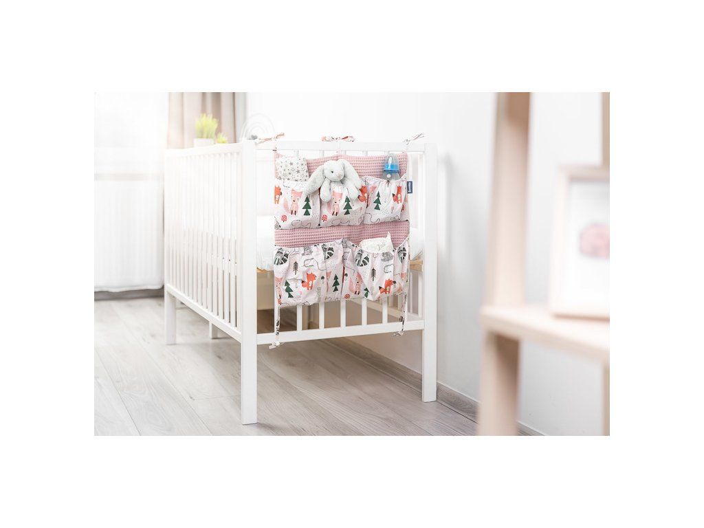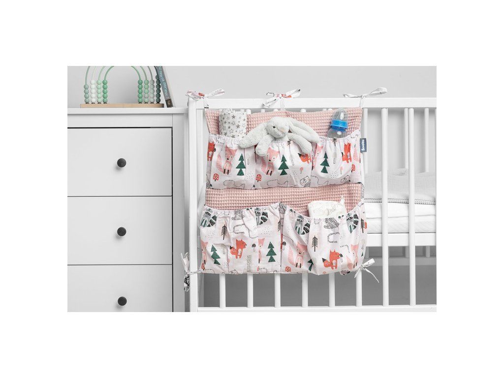 Vrecko do postieľky Sensillo je nielen praktickým výrobkom, ktorý uľahčí starostlivosť o dieťa, ale aj ozdobou detskej izby. 5 vreciek vystužených gumičkou, do ktorých sa zmestia všetky potrebné doplnky. Horné vrecká majú rozmery približne 15 cm x 15 cm, dolné vrecká 24 cm x 18 cm. Dajú sa ľahko pripevniť k rámu postieľky pomocou všitých stúh. Je dodatočne vystužená vrstvou antialergickej silikónovej netkanej textílie. Vrecká možno doplniť ďalšími výrobkami z našej ponuky.