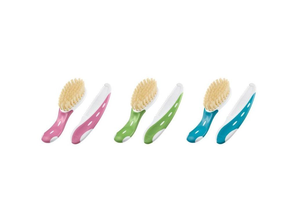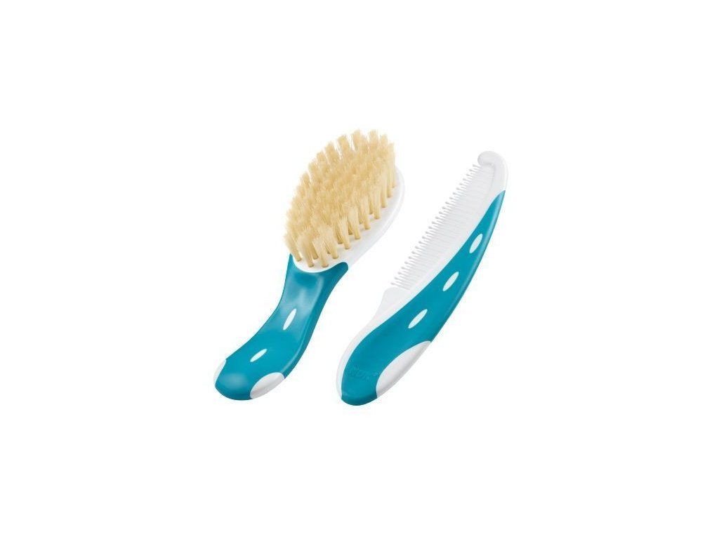 Nuk zubná kefka a hrebeň. Kefa na vlasy z jemných prírodných vlákien s hrebeňom. Kefa jemne masíruje pokožku hlavy dieťaťa, čím podporuje krvný obeh a posilňuje a upravuje vlasy. Hrebeň má zaoblené okraje, čo uľahčuje starostlivosť o dieťa. Protišmyková rukoväť zaisťuje pohodlné uchopenie hrebeňa a kefy. Vhodné pre deti od narodenia.Dodatočné parametre