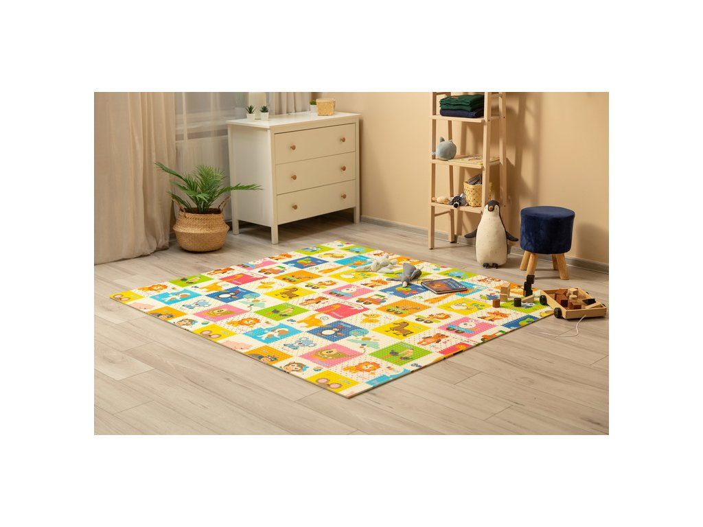 Rozmery 200 x 180 cm poskytujú dostatok priestoru na hranie alebo učenie chôdze. Pretože je vyrobená zo silnej XPE peny (1 cm) , zaistí mäkké pristátie v prípade pádu a tiež skvele izoluje proti chladu. Obojstranný dizajn umožňuje zmeniť tému a spestriť zábavu. Podložka má tašku , ktorá uľahčuje skladovanie a prepravu.