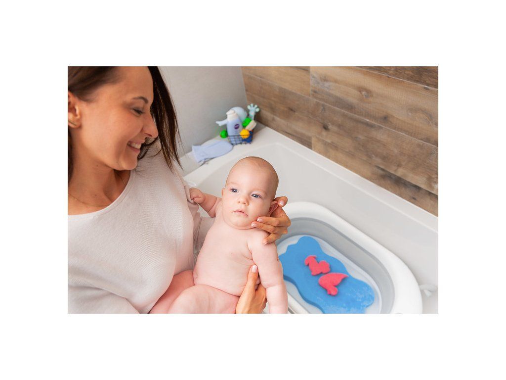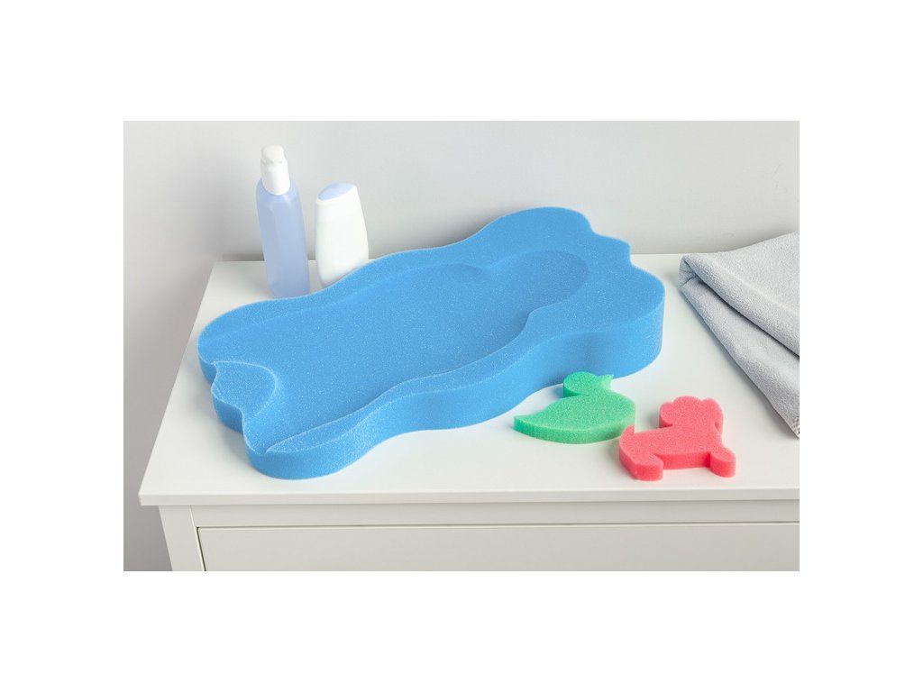 Penová podložka na kúpanie. Súčasťou balenia sú 2 umývacie hubky v tvare zvieratiek. Neobsahuje žiadne škodlivé látky. Rozmery: približne 53x28x7 cm. Zloženie: polyuretánová pena. Obrázok je len ilustračný. Farba podložky je tyrkysová.