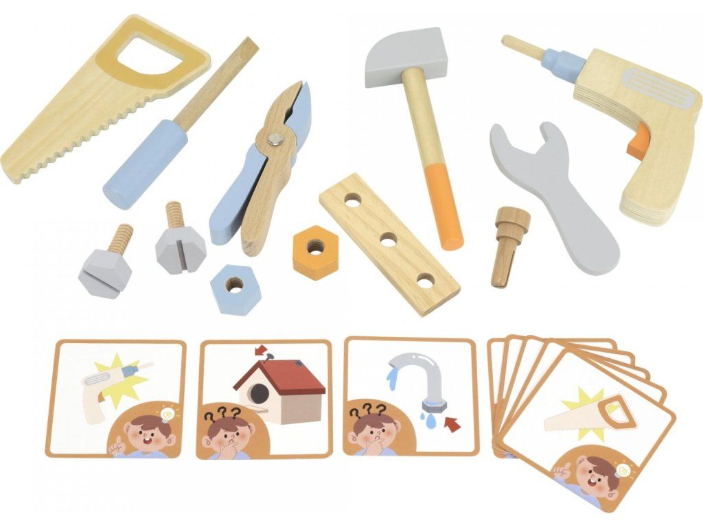 Sada obsahuje: - Píla - Skrutkovač - Kľúč - Vŕtačka - 2 matice - Kladivo - Kliešte - Drevená doska s otvormi - Skrutka - Kartičky s návrhmi, ako používať nástroje a riešiť problém - Estetický úložný kufrík Hračka je balená v puzdro na zips. Vďaka tomuto estetickému baleniu je hračka perfektná ako darček!