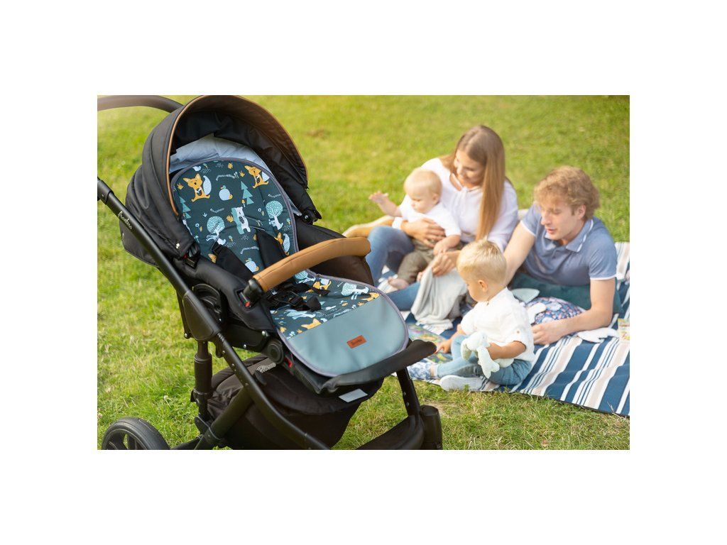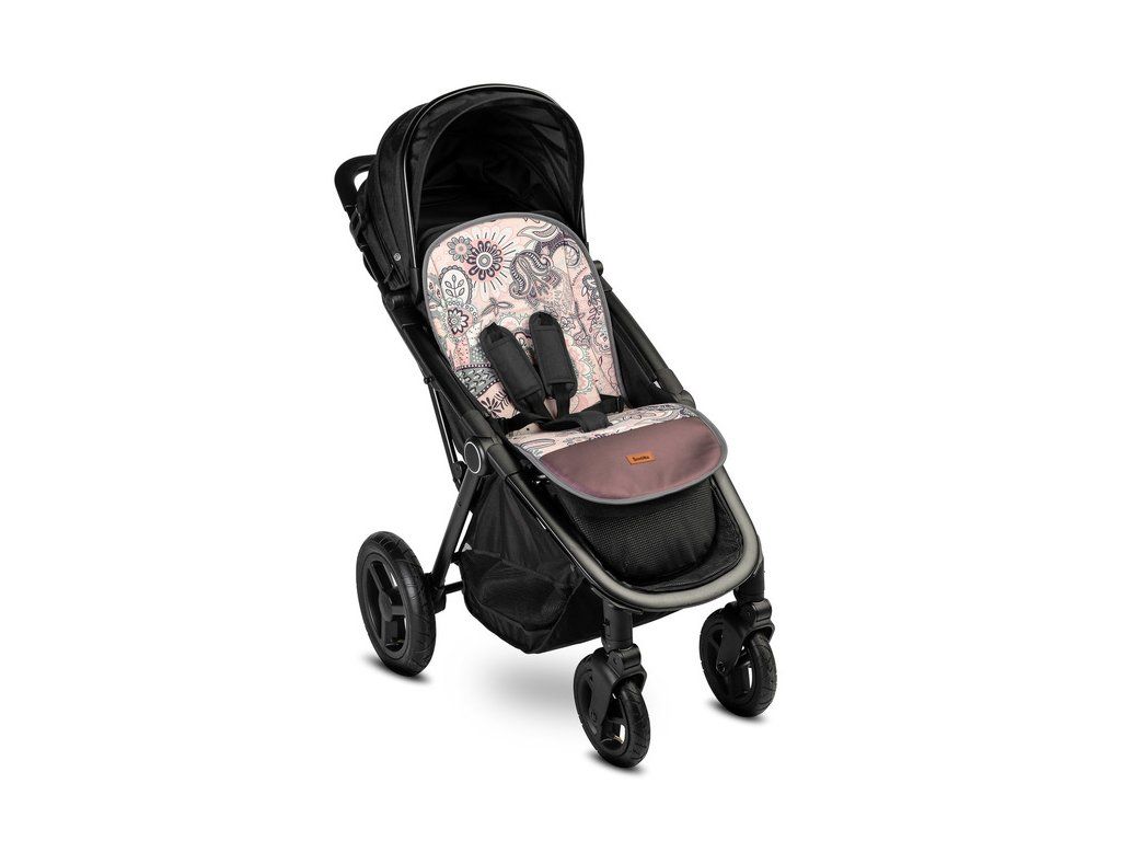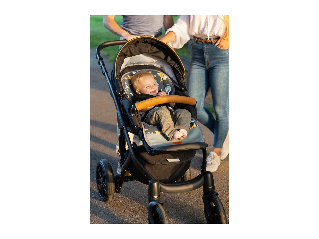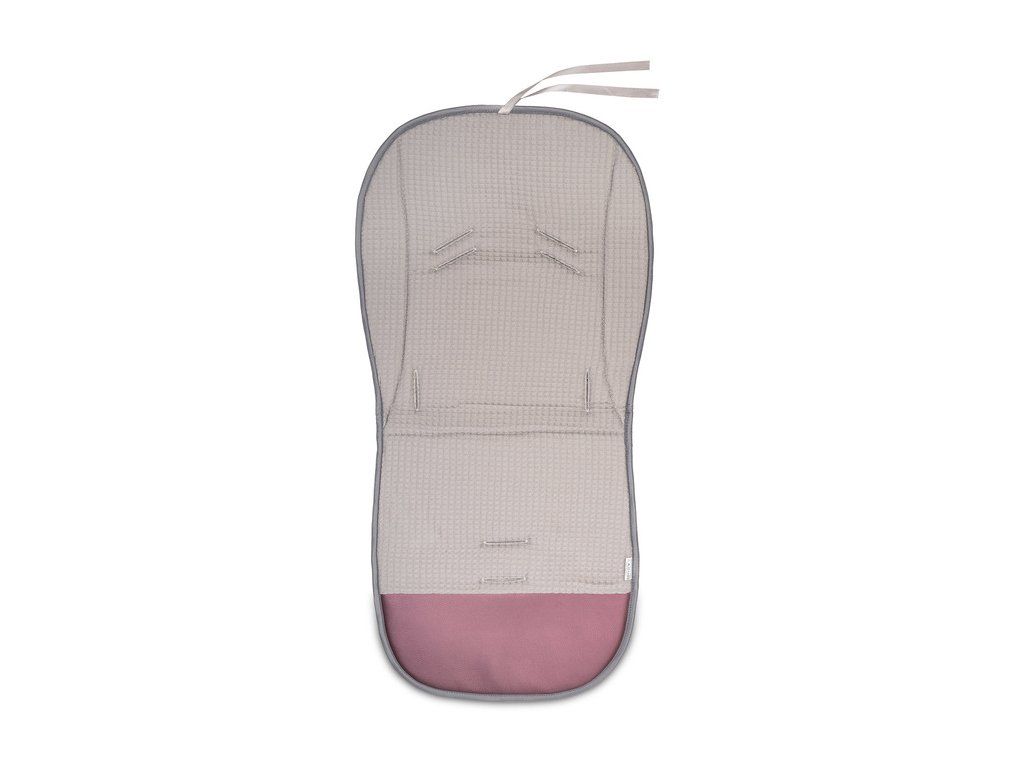 Táto univerzálna vložka do kočíka je obojstranná a vodotesná. Na jednej strane je kvalitná hladká bavlna s módnym vzorom a na druhej strane jednofarebná bavlna s vafľovou štruktúrou. Na oboch stranách v spodnej časti je pridaná ľahko čistiteľná farebná ekokoža. Podšívka pomáha udržiavať vnútro kočíka čisté a zvyšuje pohodlie pri cestovaní. Navyše má otvory na bezpečnostné pásy a stuhu na pripevnenie vankúša k súprave.