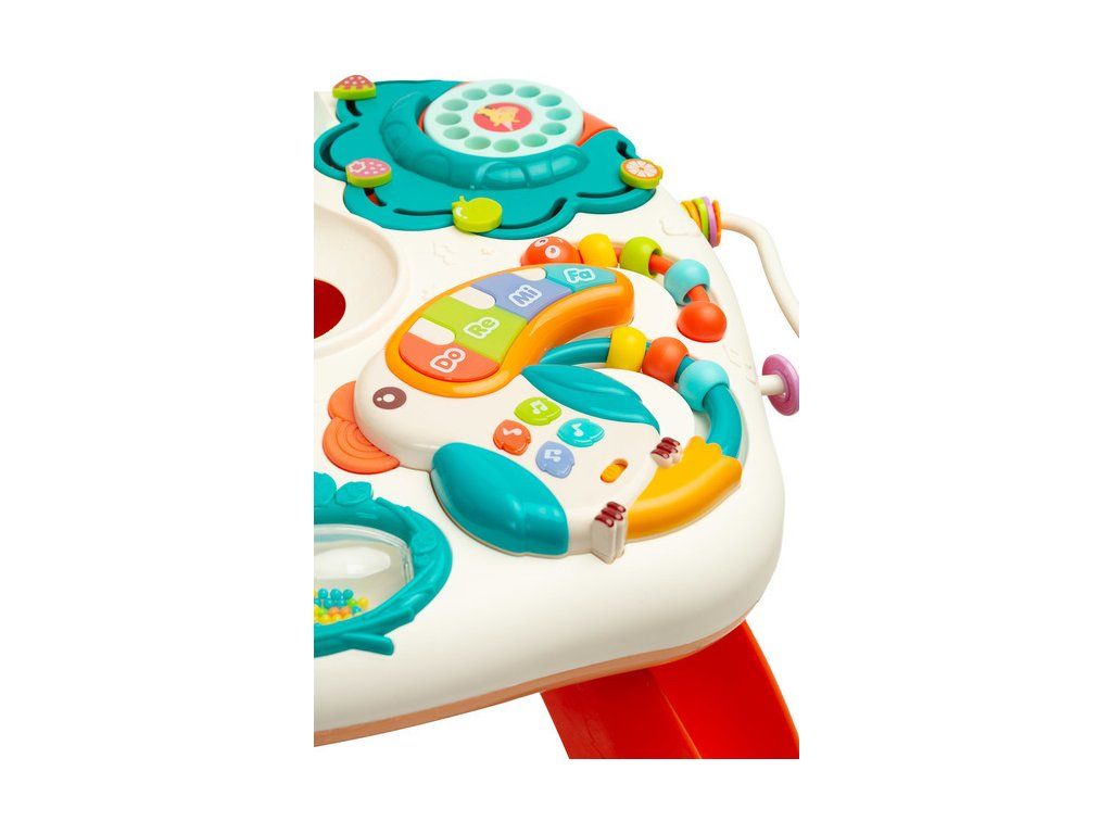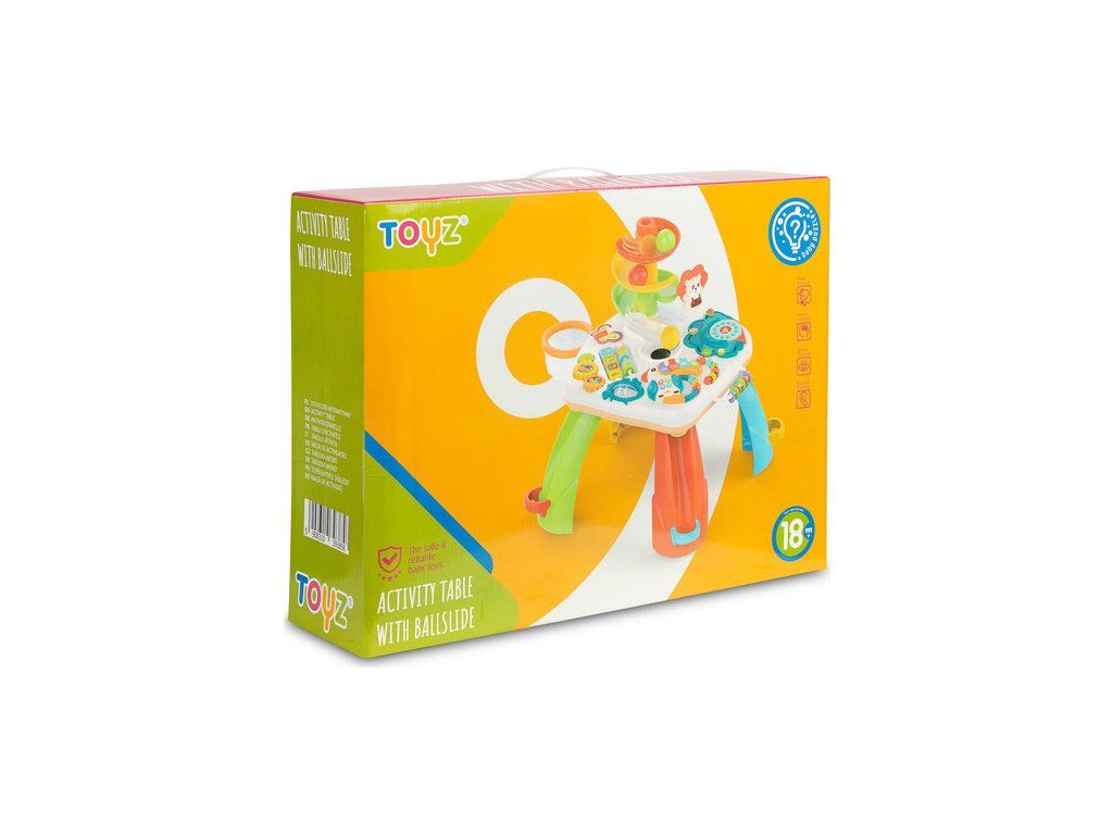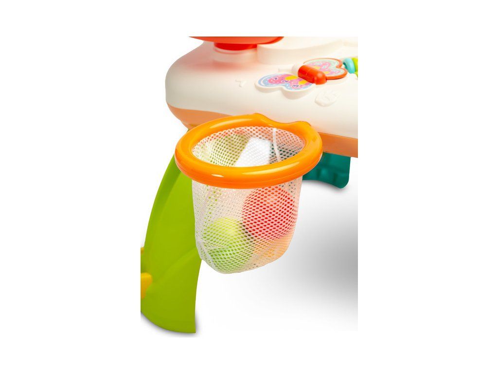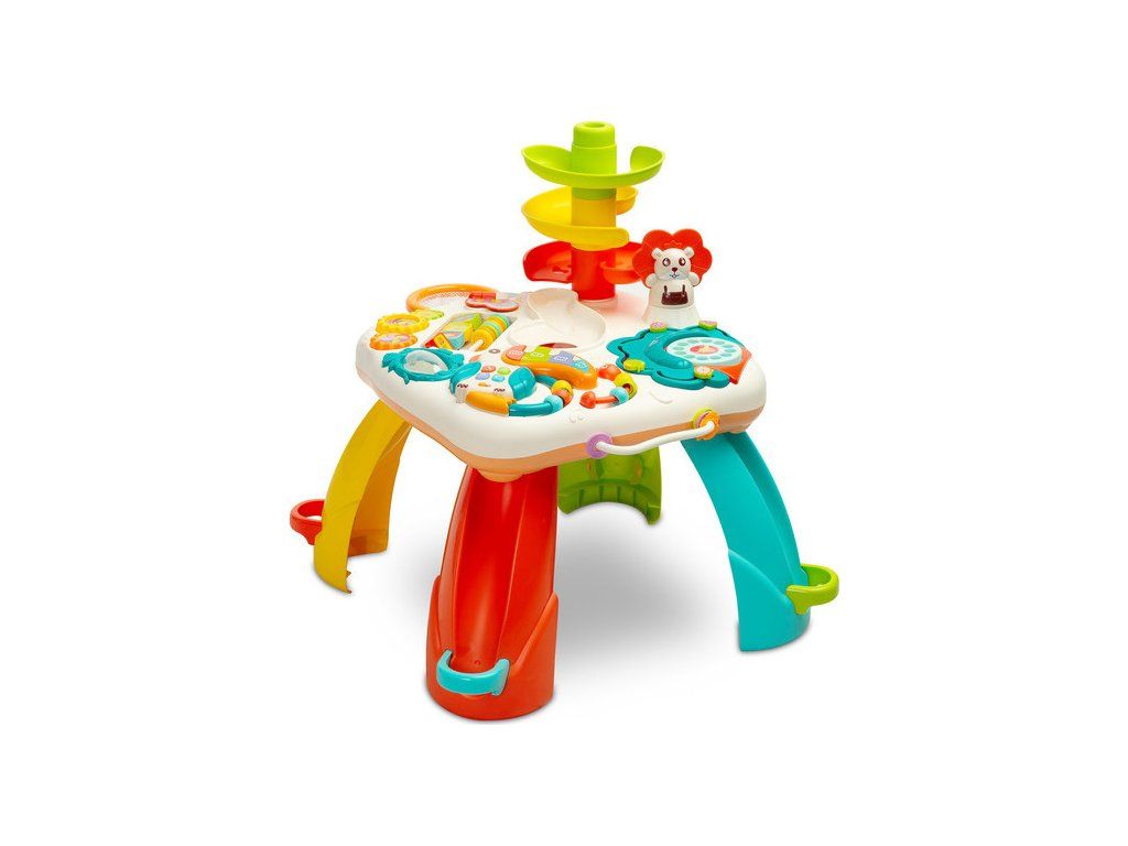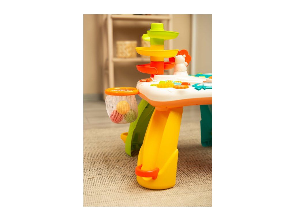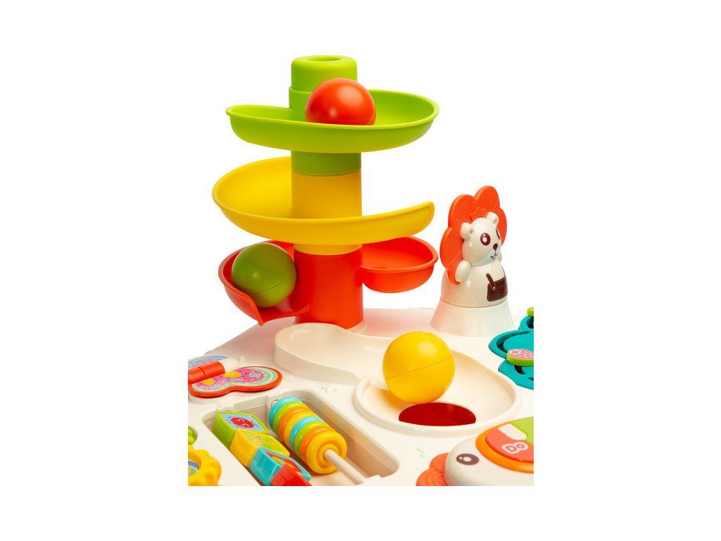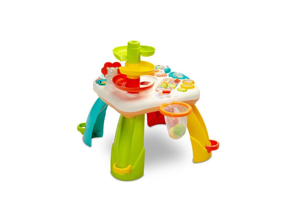 Stolík so špirálou je multifunkčná hračka určená pre deti túžiace po svete. Výrobok je vybavený sadou hrkálok, farebnými zmyslovými hračkami a hudobným panelom v tvare tukana, ktorý môže dieťa uchopiť a hrať sa s ním samostatne. Špirálová šmykľavka a 3 hrkajúce guličky keď vypadnú z otvoru poskytnú dieťaťu zábavu. Hračka je vhodná pre deti staršie ako 18 mesiacov.